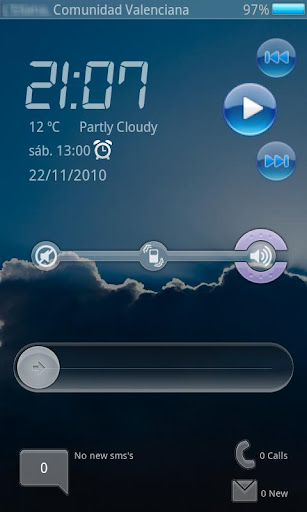 It displays time, weather, location, battery, music player, current song, calendar events and volume settings, all in a futuristic and pretty interface.