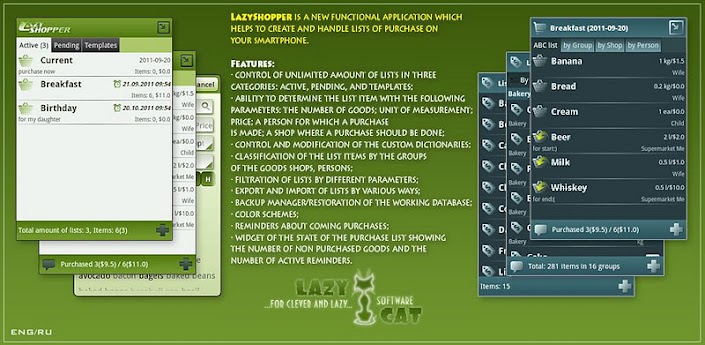 Overview: LazyShopper is a new functional application which helps to create and handle lists of purchase on your smartphone. A distinctive peculiarity of this application is an easy-to-use work with lists, a capacity of forming of templates/recipes, extended functions and work with the groups of the lists, nice and neat design, and fine setup for any user. A big and built-in dictionary will help you to create a list. Using built-in widget you will always have an access to information about list conditions, and reminders will not let you miss important purchases.