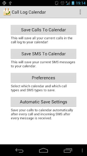 Automatically saves calls to your device's calendar. You can chose which type of calls to save, whether to save location and the calendar to save calls in.