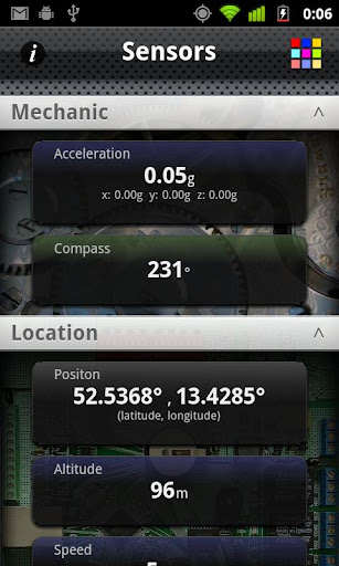 Overview: See the values of the built in device sensors all together in one app. Supports (if available) acceleration, heading (compass), position, altitude and speed.